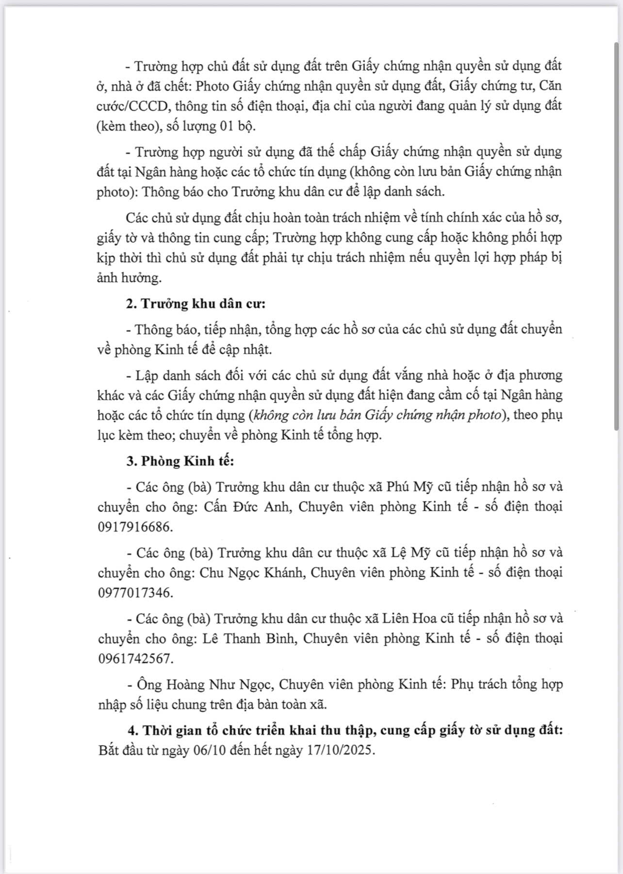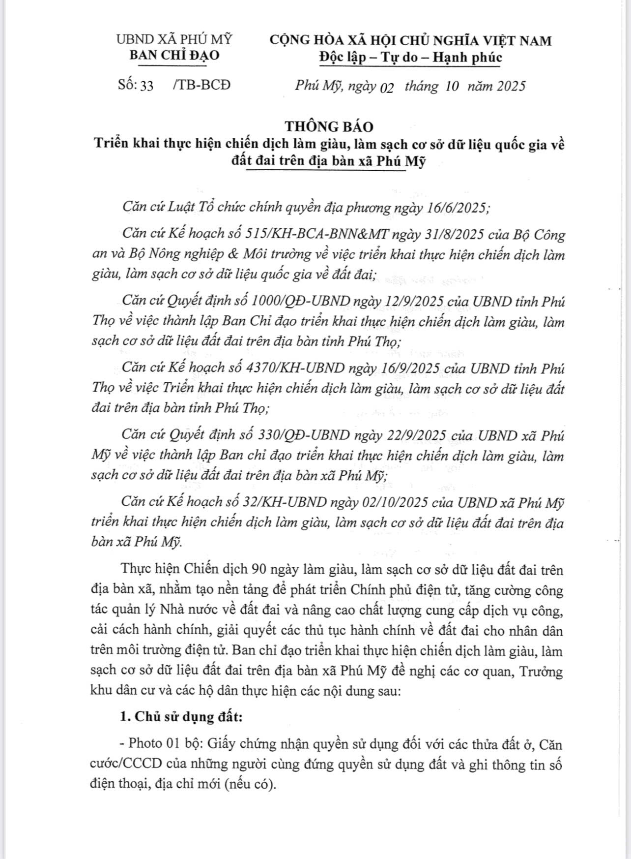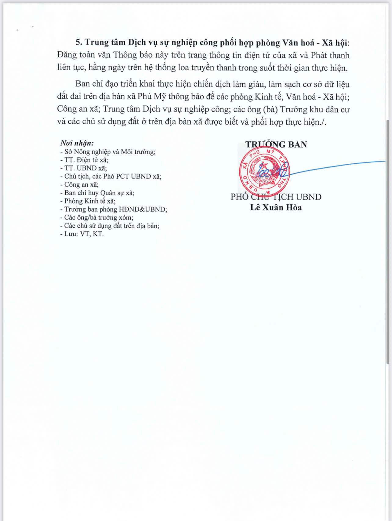 Thông báo Triển khai thực hiện chiến dịch làm giàu, làm sạch cơ sở dữ liệu quốc gia về đất đai trên địa bàn xã Phú Mỹ