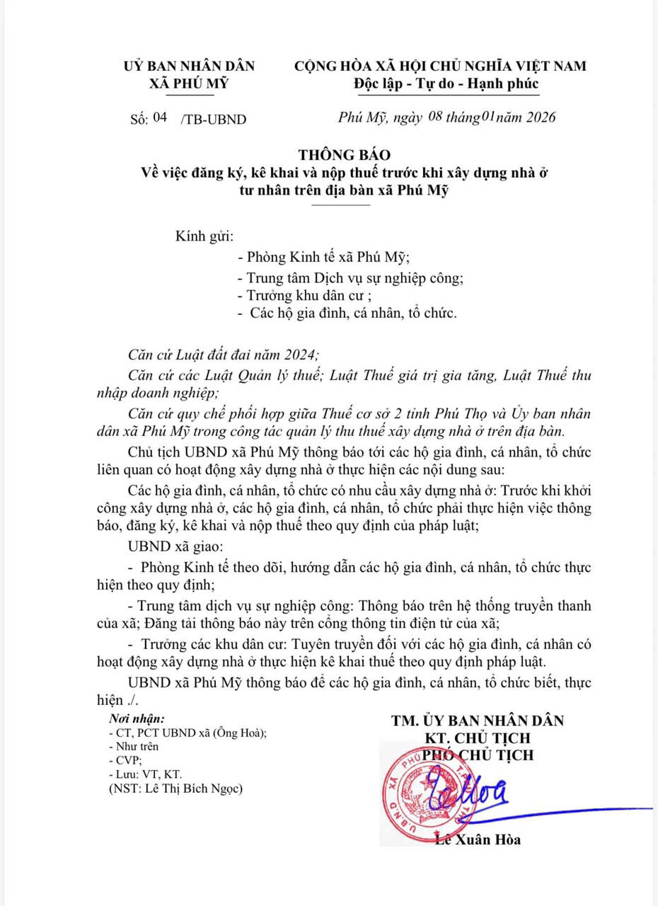THÔNG BÁO Về việc đăng ký, kê khai và nộp thuế trước khi xây dựng nhà ở tư nhân trên địa bàn xã Phú Mỹ